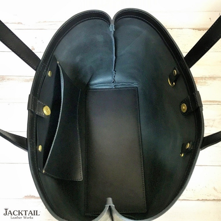 素材は通常トートバッグで使用しているオイルレザー(黒)と同じく黒の糸で落ち着いた仕上がりです。